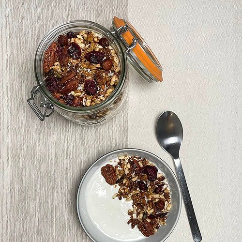 Preheat the ovenHeat to 150-160°C (300-325°F). Line one or two large baking sheets with parchment paper. Warm the wet ingredientsIn a microwave-safe bowl or small saucepan, combine the olive oil (or coconut oil), honey, and water. Microwave for 1-2 minutes (or heat gently on the stove) until the honey dissolves and the mixture is pourable. Stir well. (This step makes it easier to coat everything evenly.) Mix the dry ingredientsIn a large bowl, combine the rolled oats, pecans, hazelnuts, pumpkin seeds, sunflower seeds, sesame/linseeds/chia, puffed amaranth (or alternative) and salt. Pour the warm honey-oil mixture over the top and stir thoroughly until everything is lightly coated. BakeSpread the mixture in a thin, even layer across your prepared baking sheets. Bake for 30-45 minutes, stirring gently every 10-15 minutes for even toasting. Watch closely in the last 10 minutes to prevent burning; it's ready when golden brown and fragrant. Cool and add mix-insRemove from the oven and let cool completely on the baking sheet. Once cooled and crisp, stir in the dried cranberries and shredded coconut. StoreTransfer to an airtight jar or container. It keeps well at room temperature for up to a month.